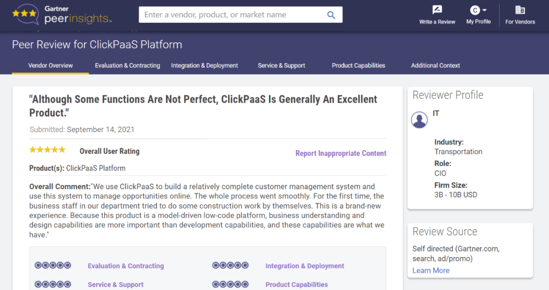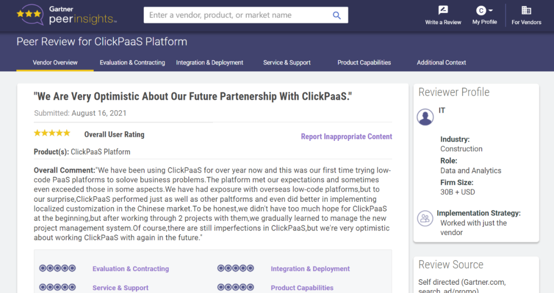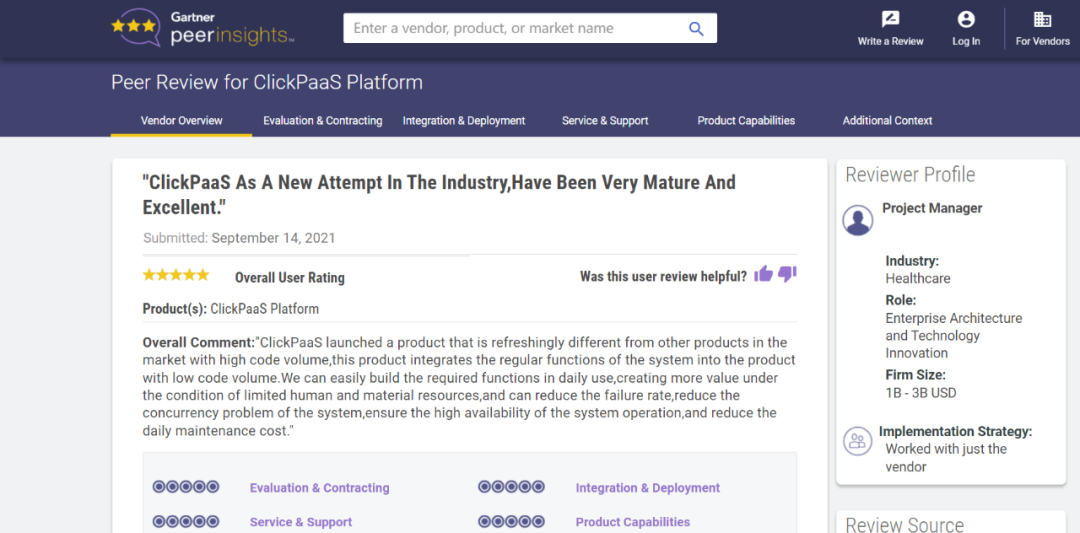 Tips:::::::::::::【Peer Insights】——用户对企业IT产品和服务发布真实评价的平台。。。。。。。。。。。。。。。目前已有355个市场,,,,,,,,,,,255,000条经过验证的评价。。。。。。。每一条评价Gartner会针对参评企业营收规模及参评人员信息做验证、、、、评价内容做多维核实。。。。。。。。。。。。